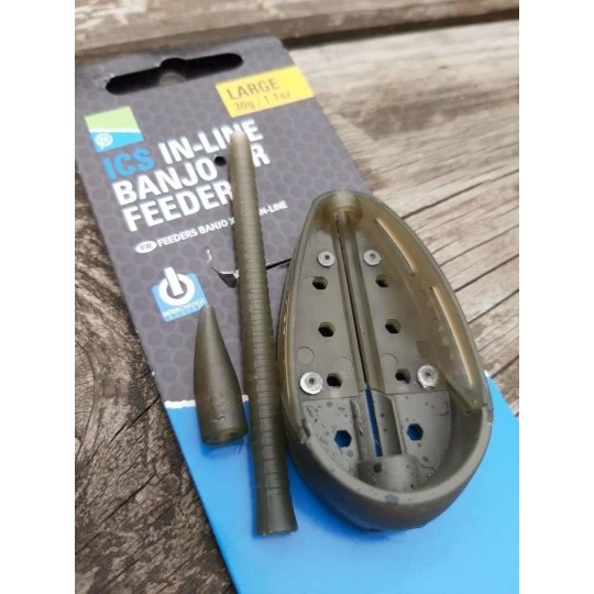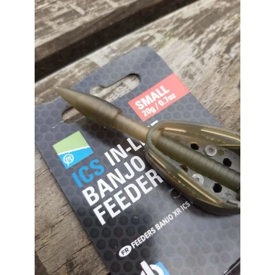 De Preston ICS Inline Banjo XR Feeder is een evolutie van de populaire Dura Banjo voerkorf, en is de perfecte optie voor zowel karper en witvis. Ideaal voor wanneer je het lokvoer meer wilt beschermen dan bij een standaard method feeder. Geschikt om te gebruiken op elke afstand, maar door het naar voren geplaatste gewicht kunnen ze met gemak op grote afstanden gevist worden. De combinatie van plastic en lood maakt dat je er zeker van kunt zijn dat al het voer gepositioneerd kan worden in het perfecte gedeelte van de voerkorf, om zeker te zijn van grote afstanden en accurate worpen. Als onderdeel van het Interchange System maakt de Banjo XR Feeder het mogelijk om van formaat en gewicht te wisselen, zonder dat de gehele montage uit elkaar gehaald hoeft te worden.