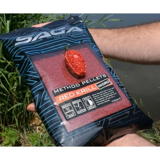 De SAGA methodpellets bezitten een sterke en oplosbare kleefkracht, waardoor stevig aangedrukte pellets op de bodem goed loskomen van een methodfeeder. Zet deze micro pellets 2 min. onder water, om ze vervolgens af te gieten. Na 30 min is het water volledig tot de kern door gedrongen en ontstaan er mooi zachte en kleverige pellets. Ideaal voor gebruik in combinatie met een method mould en feeder.